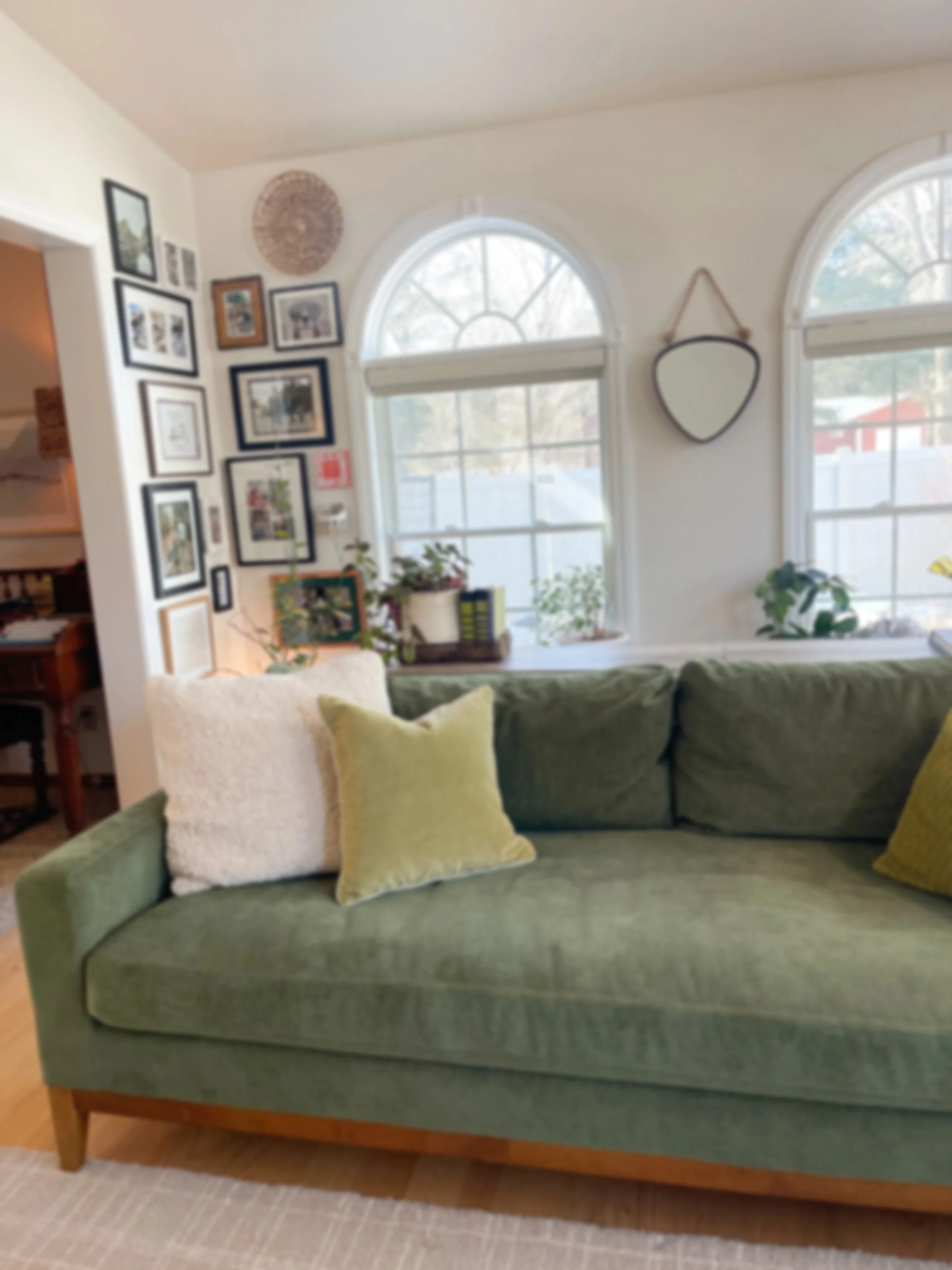 This once cold, forgotten dining room was transformed into a cozy plant, tea, and TV retreat flooded with beautiful natural light. We layered the space with lush greens and playful patterns to bring warmth and personality, creating a room that feels both fresh and inviting. A sentimental mosaic gallery wall adds heart and story, turning the space into a cheerful, lived-in escape perfect for slow mornings, afternoon tea, and relaxed evenings in.